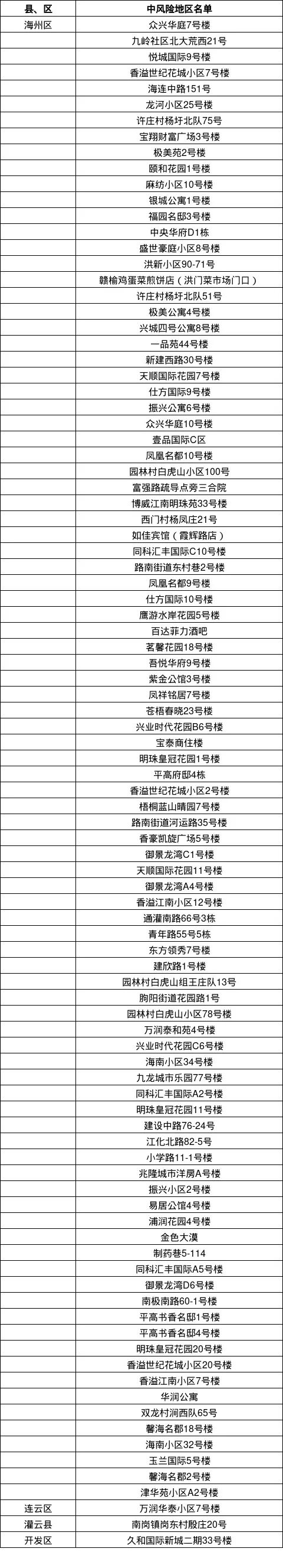 海州區潤琦苑3號樓、天景美地4號樓、溫僑綠苑B2由中風險地區調整為低風險地區。