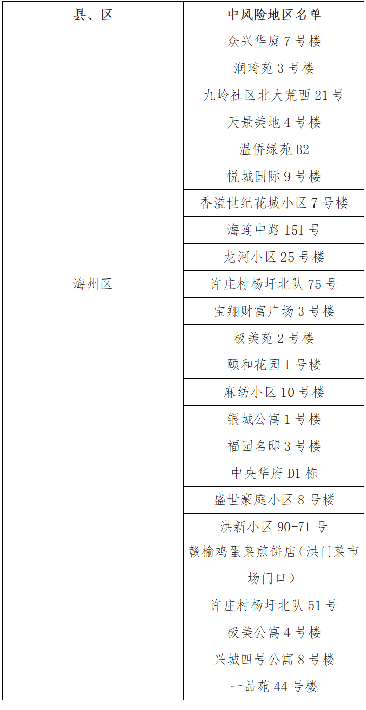 根據國務院聯防聯控機制有關規定,經綜合評估研判,市指揮部決定,自發布之日起,將頤和花園1號樓、麻紡小區10號樓、銀城公寓1號樓、福園名邸3號樓、中央華府D1棟、盛世豪庭小區8號樓、洪新小區90-71號、贛榆雞蛋菜煎餅店(洪門菜市場門口)、許莊村楊圩北隊51號、極美公寓4號樓、興城四號公寓8號樓、一品苑44號樓調整為中風險地區。