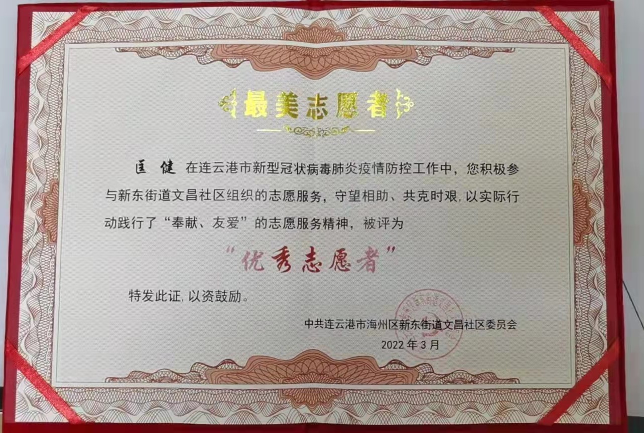 近日,公司黨員匡健、王長春分別被新東街道文昌社區(qū)、路南街道朝陽社區(qū)授予“最美志愿者”和“抗疫先鋒志愿者”。感謝他們在疫情防控期間舍小家顧大家,同舟共濟戰(zhàn)疫情、共克時艱同擔當,守護居民群眾的健康安全,為打贏疫情防控阻擊戰(zhàn)發(fā)揮了積極作用。
