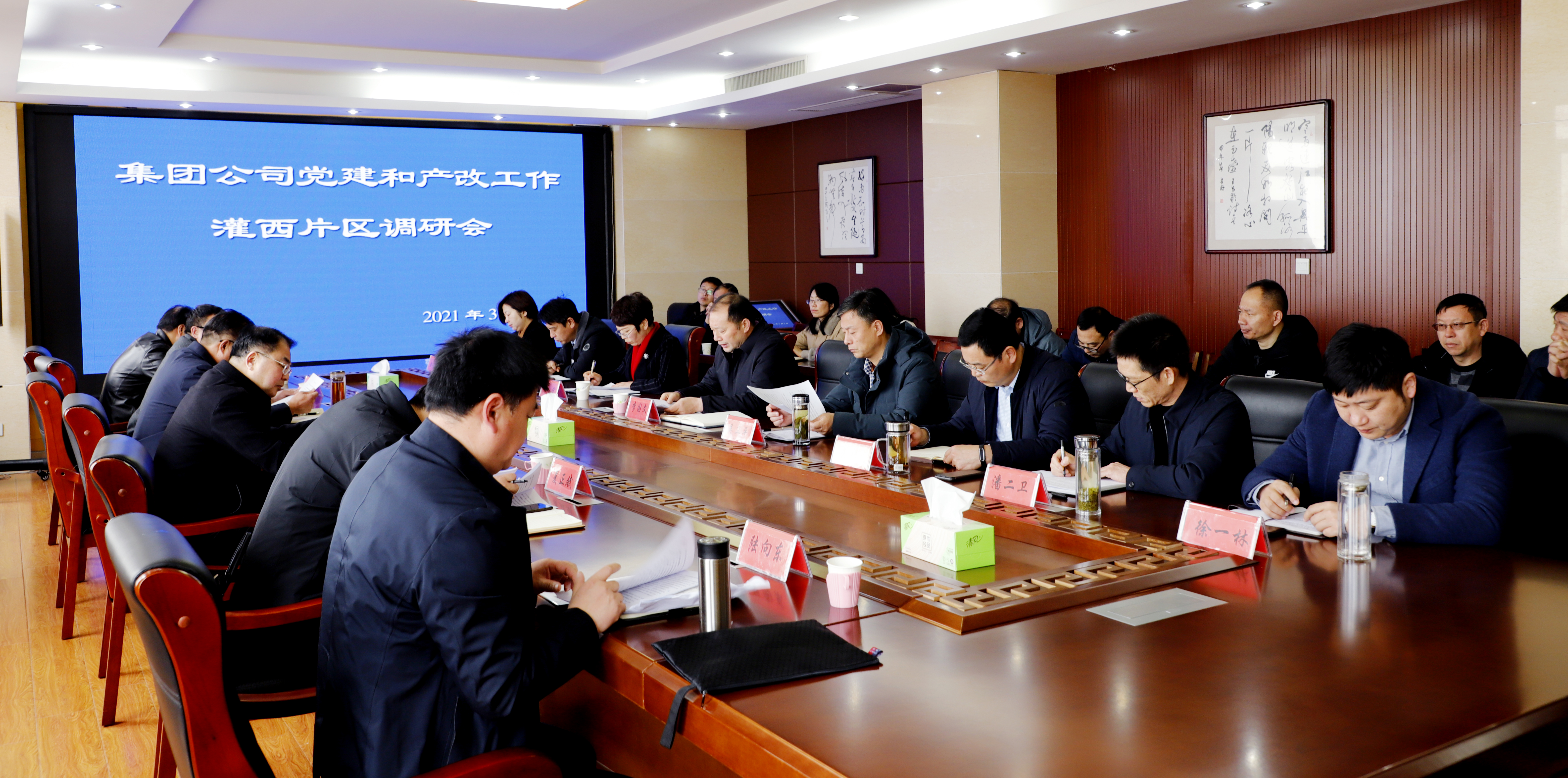 33日,集團公司黨委副書記戴鴻鳴、工會主席劉承志一行來灌西調研指導黨建和產業工人隊伍建設改革工作,灌西投資公司黨委書記、董事長、總經理李國文及領導班子成員陪同調研。