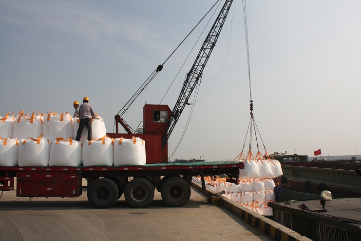 10月6日上午9時許,隨著一聲汽車長笛,一輛載有近40噸化工物資的卡車徐徐停靠在宵洋物流公司五灌河碼頭邊,緊接著碼頭鐵臂起舞,機械操作工宋成龍、楊棟梁嫻熟地操縱著塔吊機械,王緒銀、駱公友等職工敏捷地指揮吊臂準確地將一包包噸貸物資裝卸在碼頭邊的貨船中。。。。。。自此,一輛輛滿載噸袋物資的卡車便不停地駛進碼頭。