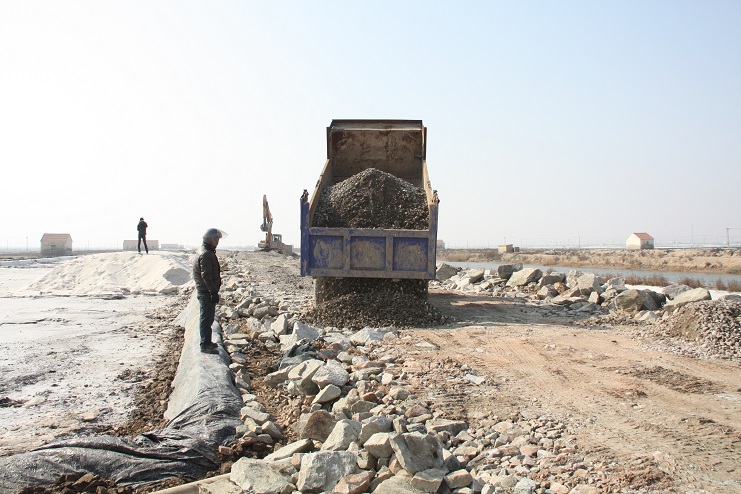 2月15日,在新河制鹽公司七至十班運(yùn)鹽路施工現(xiàn)場,我們看到南翼公司項目工程分公司的員工正在指揮兩臺小型工程車將石子傾倒在路基上,兩臺挖掘機(jī)正忙于將運(yùn)送來的石子整平。運(yùn)鹽河對面,三輛滿載土夾石的大型工程車一字排開,正等待卸載。據(jù)了解,目前正在施工的是新河制鹽分公司二期運(yùn)鹽路維修改造工程,該工程改造路段全長3300米,計劃總投資193萬元,其中路基鋪設(shè)部分由日曬制鹽公司出資45萬元,路面部分則由縣交通局承擔(dān),預(yù)計需要投入148萬元。該工程于去年底開始施工,預(yù)計三月中下旬全部鋪設(shè)完成。另外新河制鹽分公司一期一至十二班3300米運(yùn)鹽路改造工程計劃將于今年下半年實(shí)施。