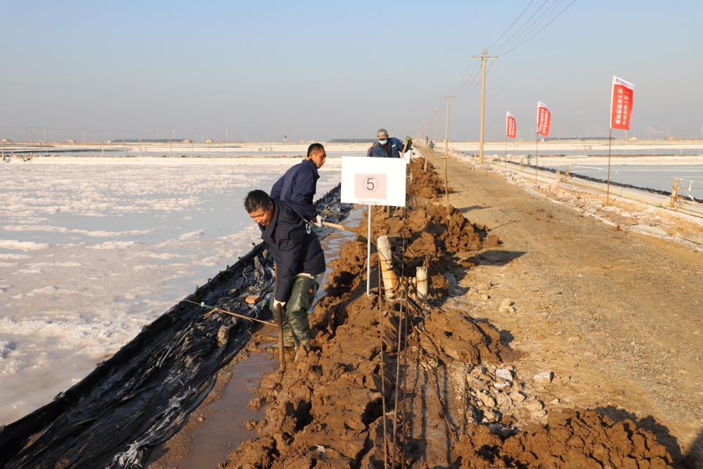 寒冬時節(jié),暖陽之下,鹽廩之旁,曬得黝黑的鹽場產(chǎn)業(yè)工人們按照競賽的考核標(biāo)準(zhǔn),做熟泥、打堰墻、做堰頂,護(hù)埝頂、夯埝坡、清塘底,見證了一場技能比拼的盛會。經(jīng)過一天的鏖戰(zhàn),潘成軍師徒取得了池堰修整第一名;董治波師徒取得了土塘清淤第一名。(西工)