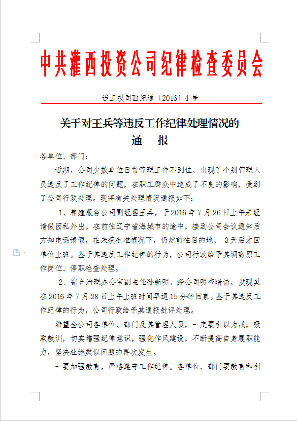 關于對王兵等違反工作紀律處理情況的通報