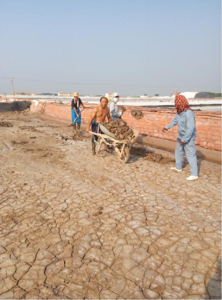 連續的高溫讓人熱得喘不過氣來,正當人們躲在空調下享受清涼的時候,日曬制鹽埒南制鹽分公司的廣大干群仍堅持奮戰在生產一線,搶抓有利天時組織生產。活碴、除硫、整理池板、做天溝各項工作穩步有序推進。汗水浸濕了他們忙碌的身影子影。