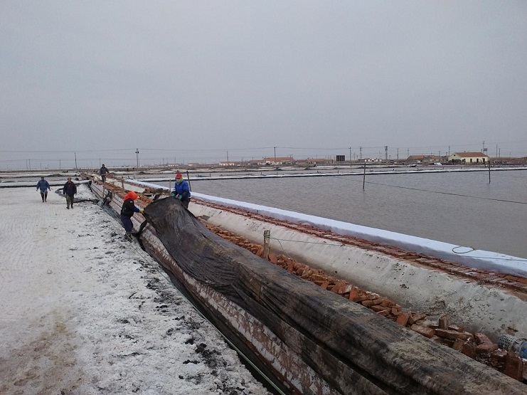 新河制鹽分公司為了盡快改善食用鹽基地面貌,減少池埝上固化紅磚風(fēng)化,沙塵落入鹽池內(nèi),對(duì)池鹽的污染,近期組織分公司職工,對(duì)基地塑池的紅磚固化池埝進(jìn)行處理,先用黑塑布把池埝重包一遍,然后再用土工布苫好。有效地減少了雜物落入池鹽中,為產(chǎn)合格食用鹽提供了良好生產(chǎn)環(huán)境。(圖為職工們正在苫蓋紅磚固化池埝。)