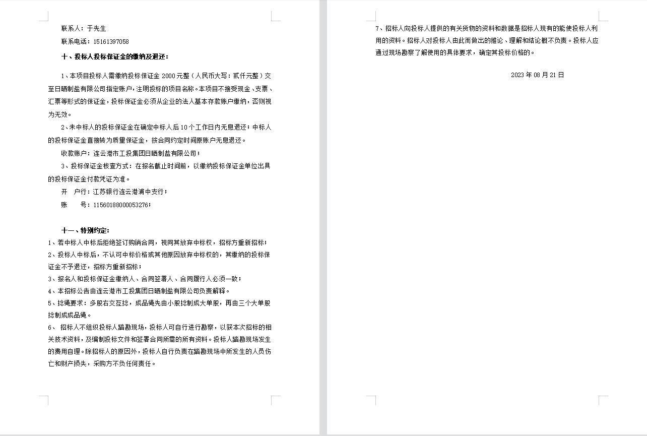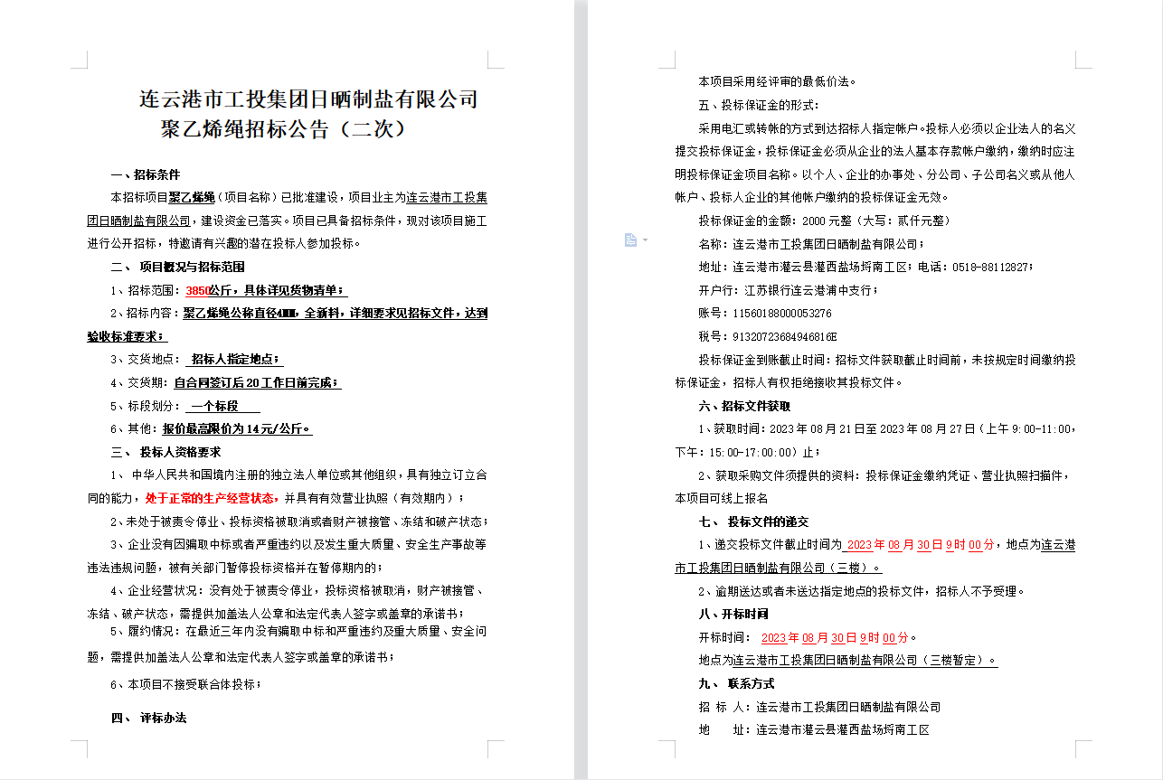 連云港市工投集團日曬制鹽有限公司聚乙烯繩招標公告(二次)