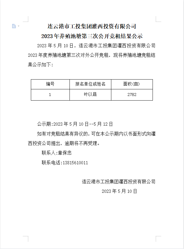 連云港市工投集團灌西投資有限公司2023年養殖池塘第三次公開競租結果公示