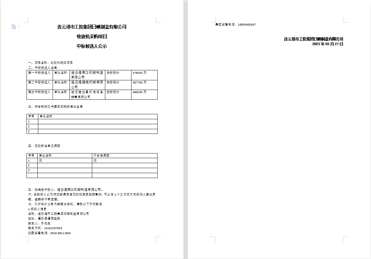 連云港市工投集團日曬制鹽有限公司收放機采購項目中標候選人公示