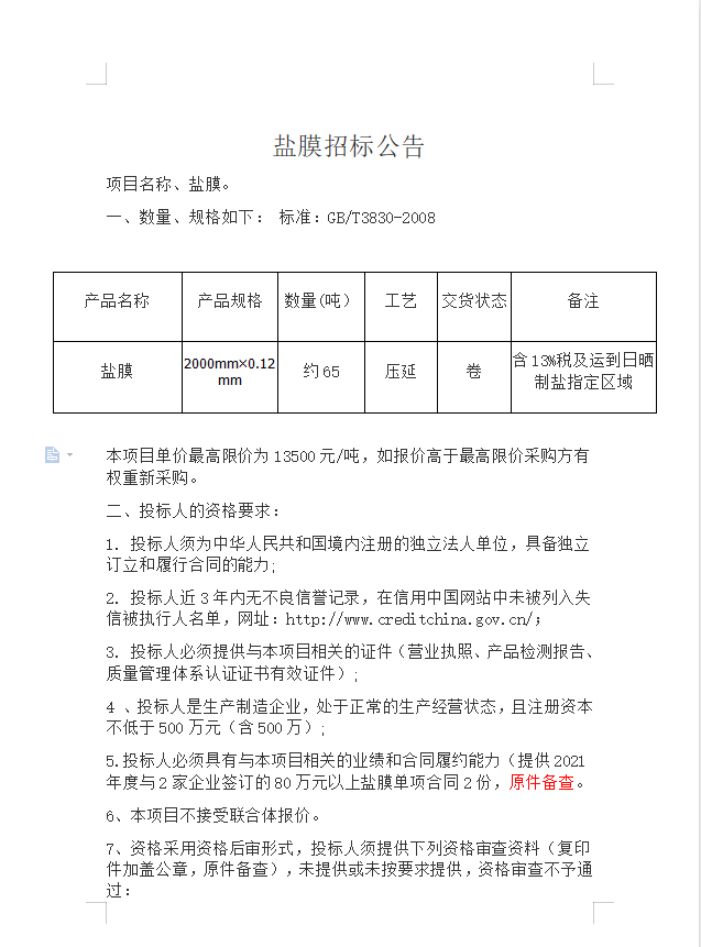 鹽膜招標(biāo)公告