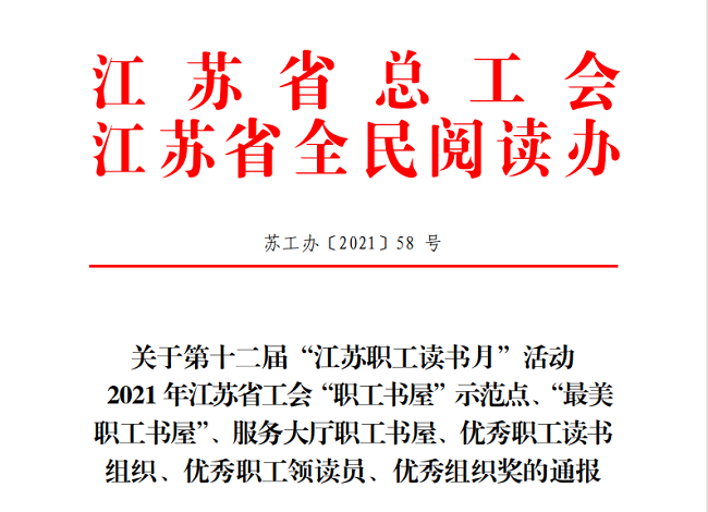 近日,江蘇省總工會、江蘇省全民閱讀辦聯(lián)合下發(fā)《關(guān)于第十二屆“江蘇職工讀書月”活動通報》(蘇工辦【2021】58號)文中,我公司職工書屋獲評2021年度江蘇省工會“職工書屋”示范點,同時獲贈圖書近200冊。