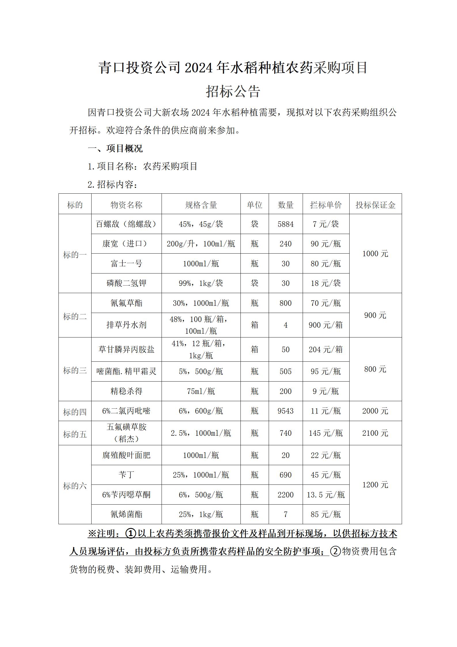 青口投資公司2024年水稻種植農藥采購項目 招標公告
