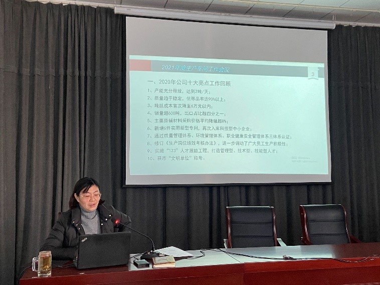 會上,公司副總經理王爽芳總結了2020年公司十大亮點工作,部署2021年生產重點工作。公司總經理助理李洋總結了2020年生產車間管理工作,提出車間2021年“5S”管理目標。