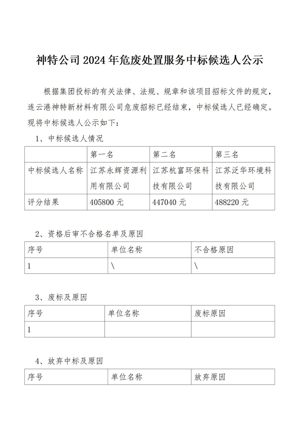 神特公司2024年危廢處置服務中標候選人公示