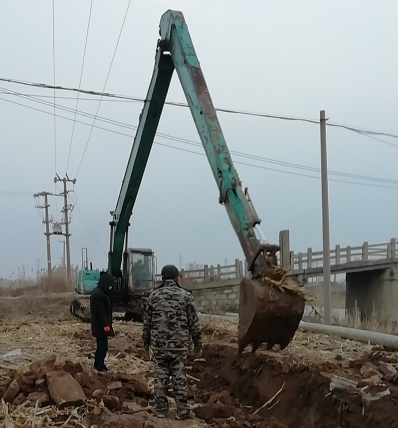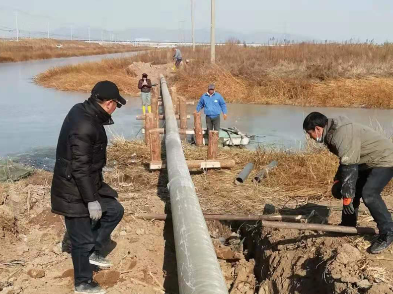 難!難!難!有困難才具有挑戰,在“四拼”前一切困難皆為“紙老虎”,大家及時將壓力變為動力。確定方案后,立即分頭行動,一切工作按部就班,購買8米木樁,河岸邊專人指揮長臂挖掘機機械打樁,頭頂高壓線與通信線路相互交織,現場安全員全過程監督指揮保障施工安全距離緊張施工,利用簡易泡沫筏人工敲開河面冰層,劃到河心鉆孔安裝木橫擔,人工開挖河對岸管道,切割吊取管道,打磨涂覆,一切都在有條不紊的進行中。考慮到玻璃鋼管道的易碎性,不敢使用挖掘機吊裝,只能全人工小心翼翼的一小段一小段的輕抬慢放,慢慢挪到門型橫擔上緩緩過河,捆綁固定,最后是對口纏裹涂覆回填竣工。