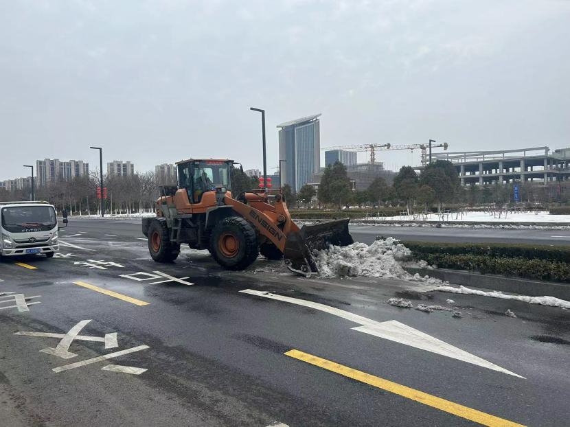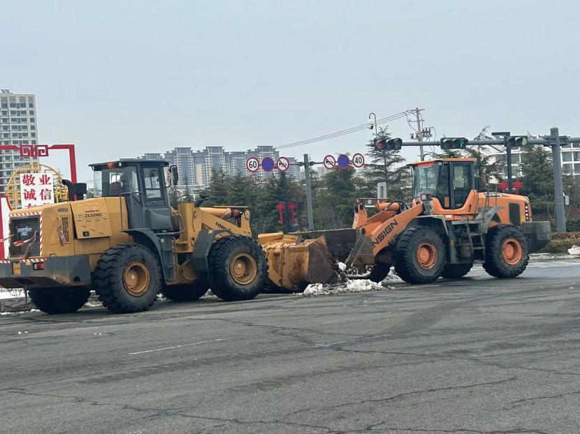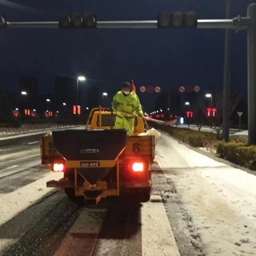 ? ? 一方有難,八方支援。由于本次降雪量大、勢急、持久,單靠環衛分公司無法全面完成任務,在上級領導的統籌考慮下,兄弟單位火速馳援,大綠化、大市政、大采購,大的不僅是業務整合,更是人心凝聚,更是集思廣益。翔立、盛達利用鈣液和工程資源優勢,通過架設大型原料桶儲備鈣液水,由3-5輛工具車進行24小時鈣液拋灑,積冰融化速度超出預期,提升了后期鏟車的工作效率,順利保證了上下班高峰期交通順暢。特別是在222日,在兄弟單位的協助下在清晨8點完成了活動路線保障及市領導掃雪除冰視察。