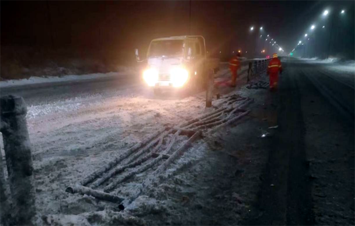 市政分公司根據公司安排,負責融雪劑裝卸工作,從23日下午到4日上午,市政分公司累計裝卸融雪劑已達150余噸。該分公司在做好保障融雪劑裝卸作業的同時,抽調4名精兵強將,處理因大雪導致的道路交通事故應急處置4起,應急處理道路護欄11節,約38米,防止交通事故二次發生。在5日凌晨更是經理盧正楊帶領10名黨員先鋒突擊隊,支援重點道路徐新路的融雪劑拋灑作業,僅靠雙手揮著鐵锨,通宵奮戰,迎難而上,高質高效完成融雪劑拋灑作業路段。(李濤)