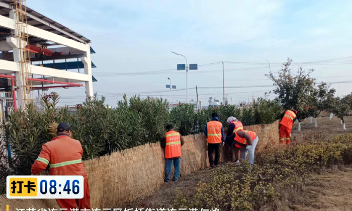 風障防寒加速進行。該分公司采購草簾500余個,對金港路、泰和路夾竹桃等不耐寒綠植精心呵護。確保低溫植株不被凍傷,不出現大面積凍害現象。目前已圍草簾300余個。